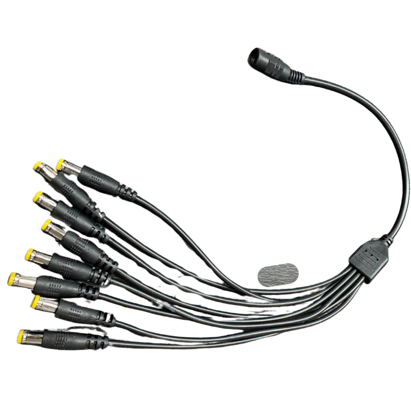 Adaptador tipo pulpo para conectar 8 cámaras. Requiere de fuente de alimentación externa. Optimiza la instalación de sistemas de seguridad más amplios, facilitando las conexiones y reduciendo el desorden de cables.